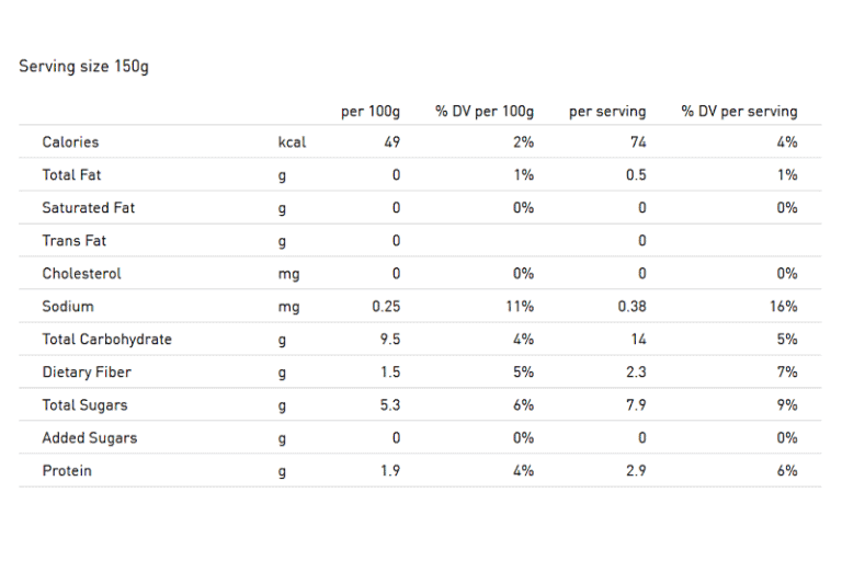 It provides a full nutrient table – also in the label format – with analysis of nutrients per 100g / per serving, plus % daily values per 100g / per serving.